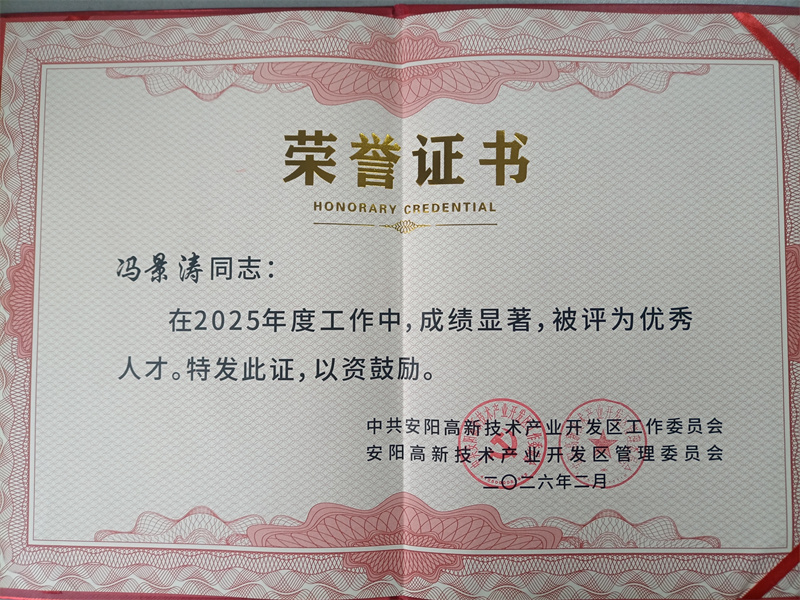 2026年2月24日,安阳(国家)高新技术产业开发区召开2025年度工作暨高质量发展会,我公司获突出贡献奖;研发部冯景涛获优秀人才奖。