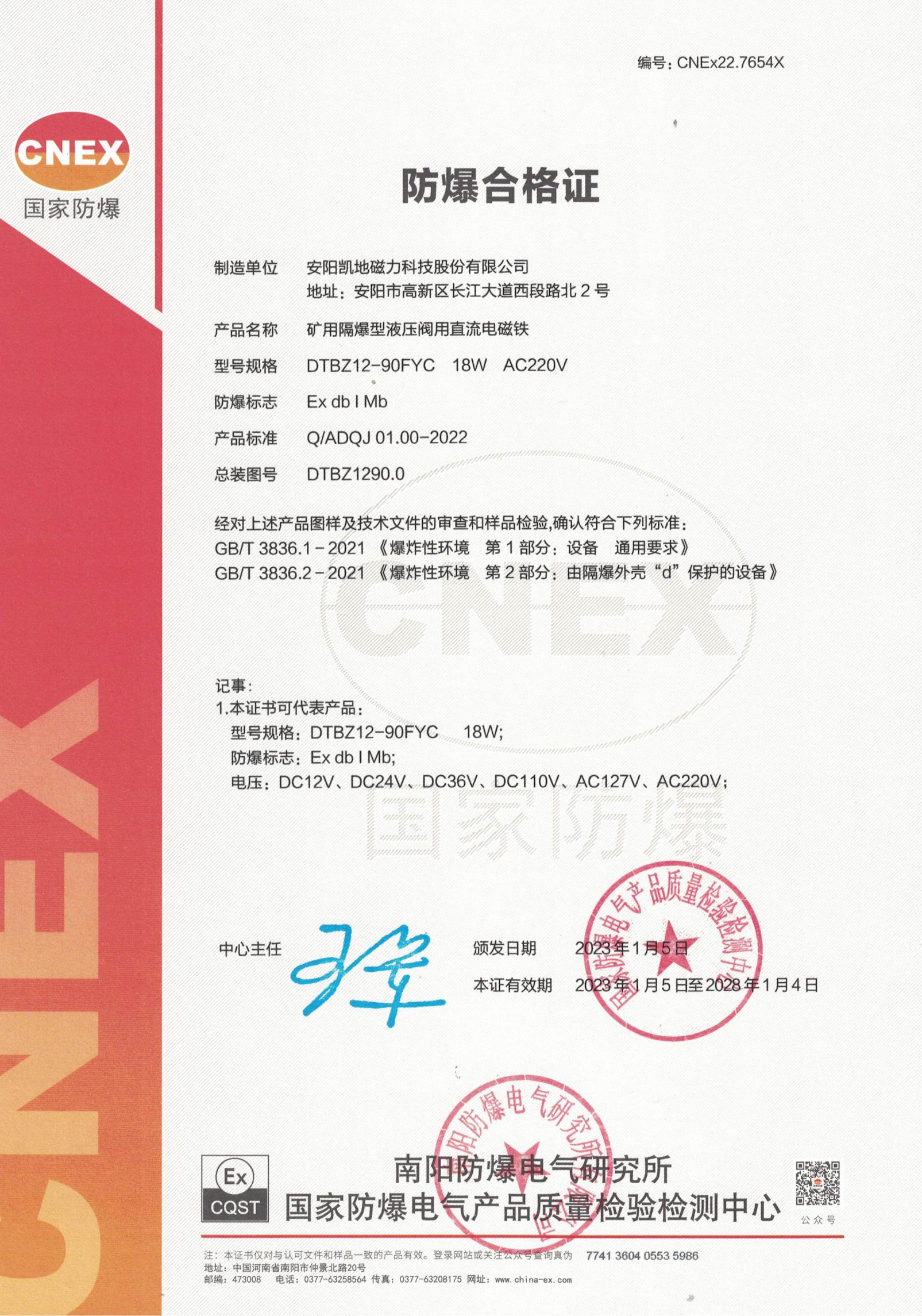 CNEx22.7654X DTBZ12-90FYC 1类防爆合格证 有效期至2028年1月4日