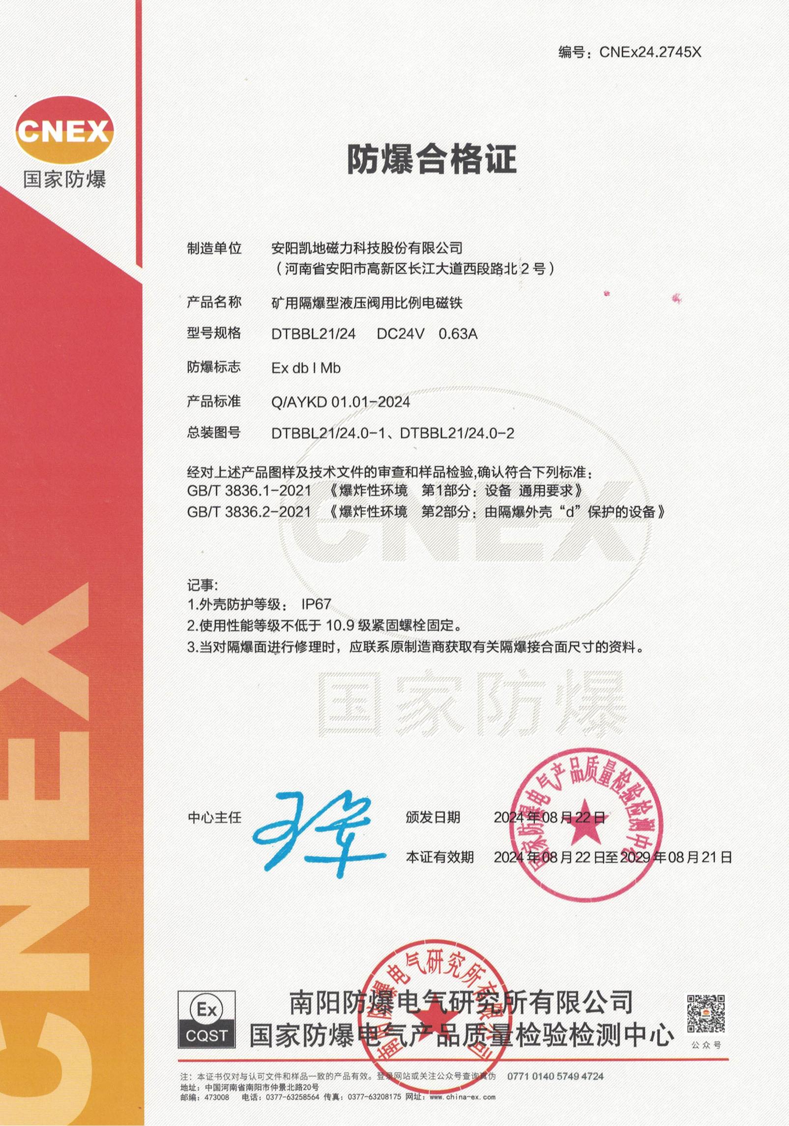 CNEx24.2745X DTBBL21 I类 防爆合格证 有效期至2029年8月21日