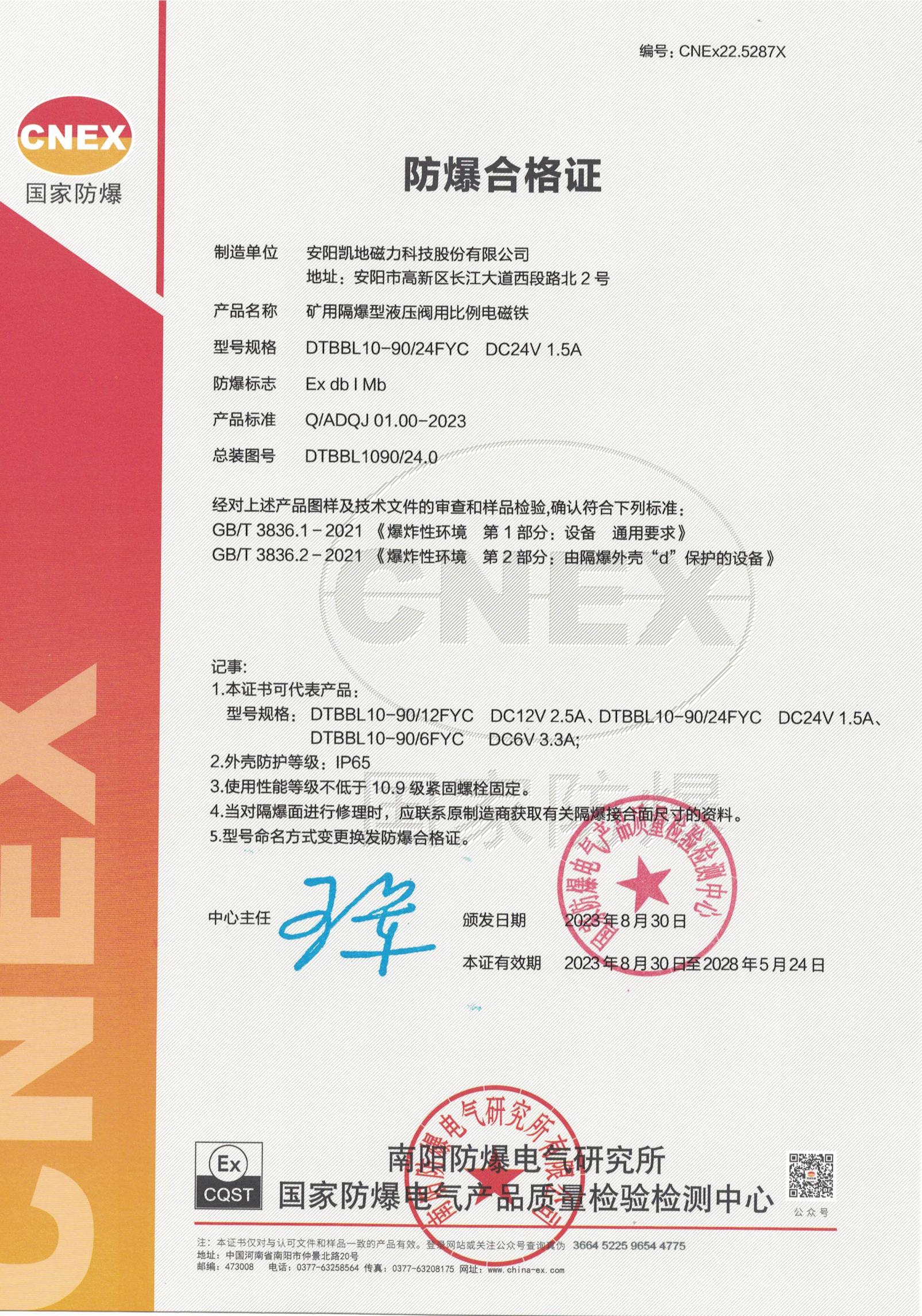 CNEx22.5287X DTBBL10-90FYC I 类 防爆合格证