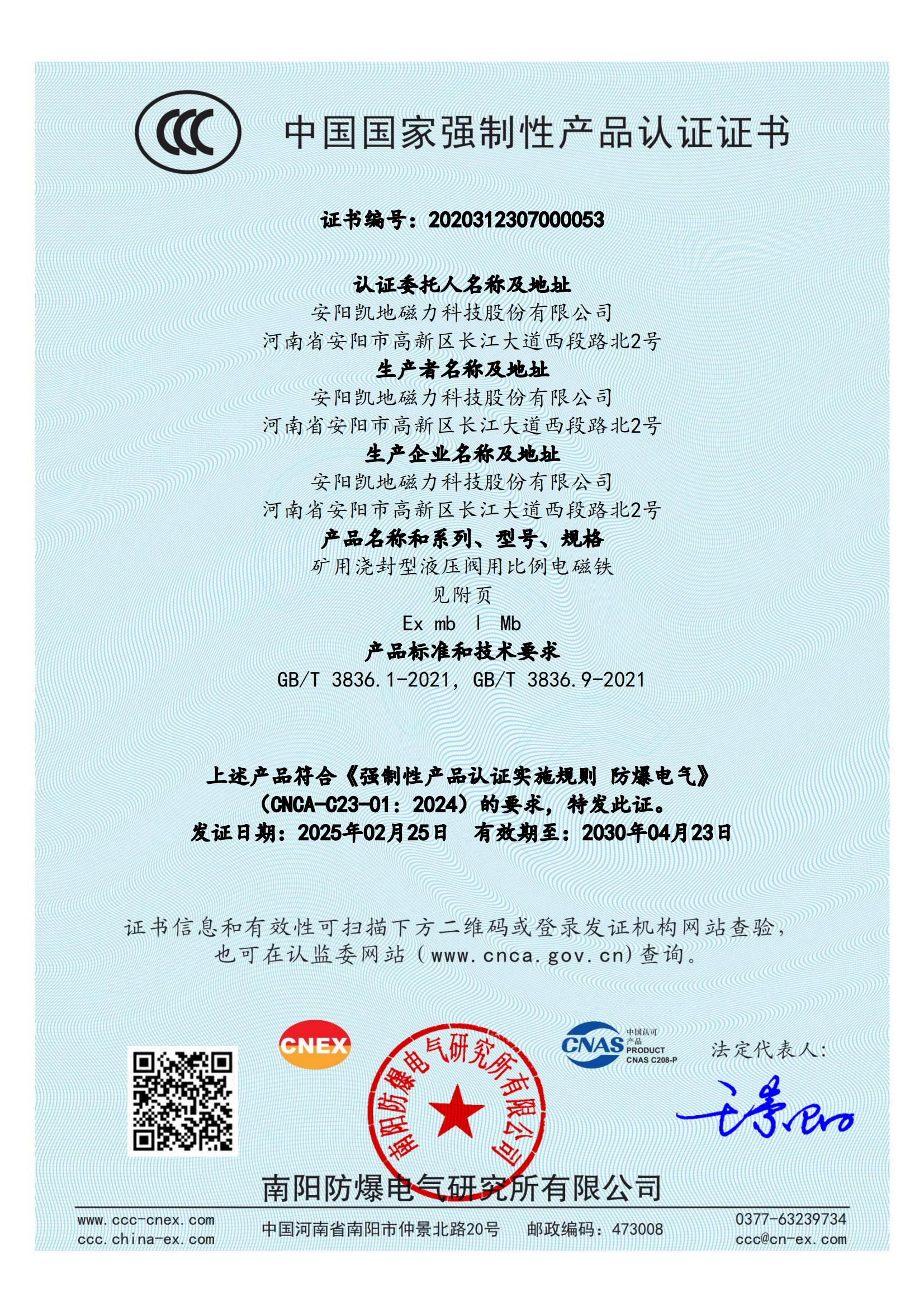 2020312307000053 矿用浇封型液压阀用比例电磁铁CCC证书 有效期至2030年4月23日_00